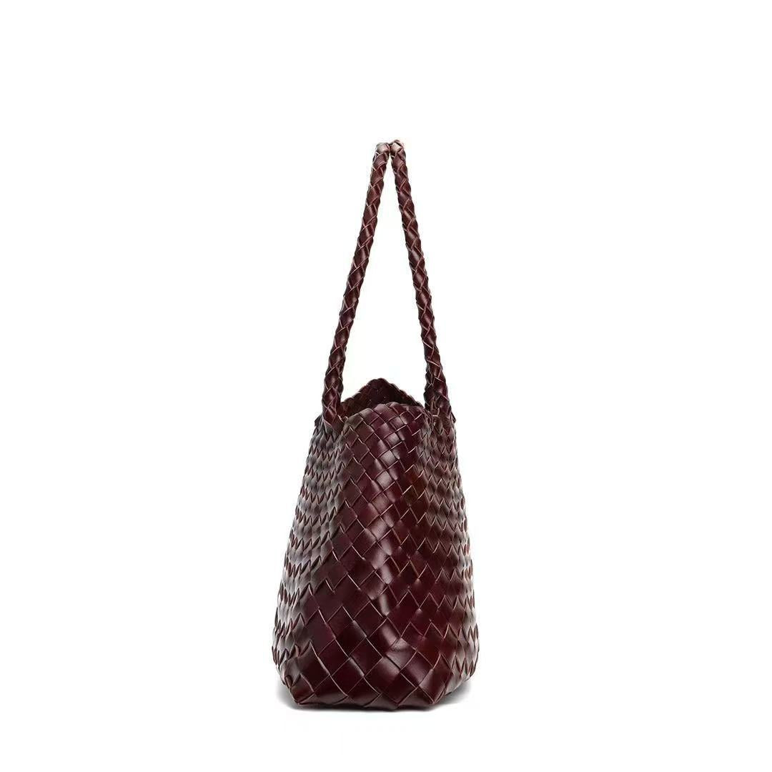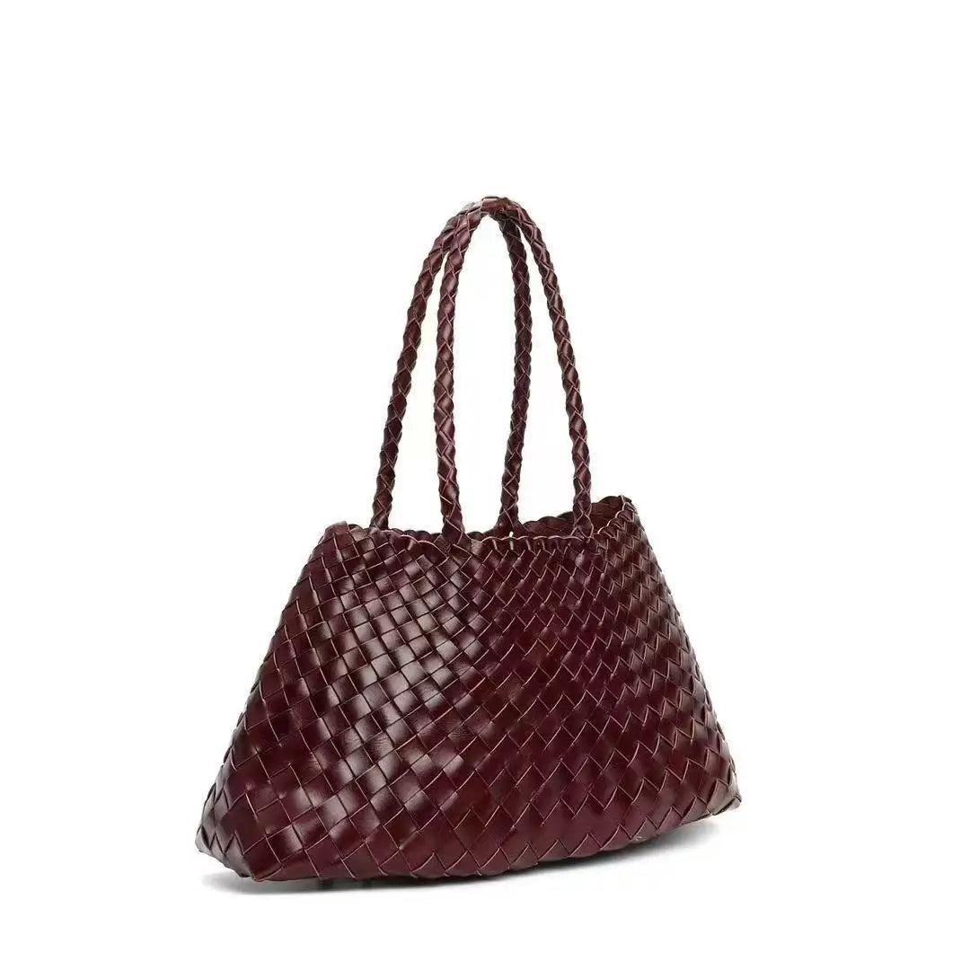 Stella er en eksklusiv toteveske i ekte kuskinn med håndvevd design og tidløs eleganse. Den dype burgunderfargen gir vesken karakter og gjør den like opplagt til jobb som til kveldsbruk.